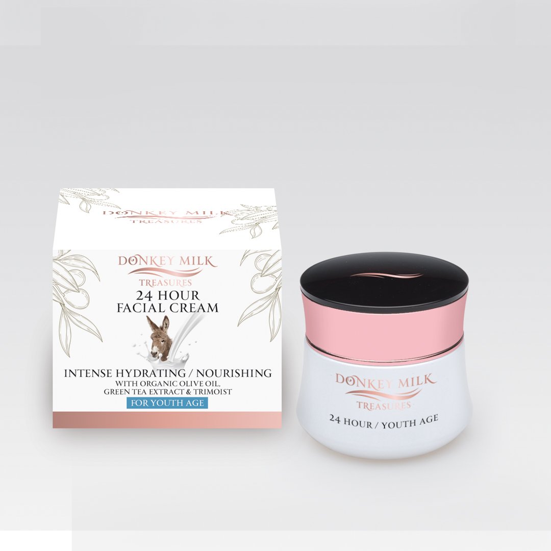 24ωρη θρεπτική & ενυδατική κρέμα προσώπου για όλους τους τύπους δέρματος. Με 100% Ελληνικό γάλα γαϊδούρας κρυογονικής επεξεργασίας*, ενυδατικό τριπλής δράσης TRIMOIST, αντιοξειδωτικό εκχύλισμα πράσινου τσαγιού και οργανικό ελαιόλαδο.Το γάλα γαϊδούρας θεωρείται από την αρχαιότητα ελιξίριο για δερματική φροντίδα και ομορφιά.