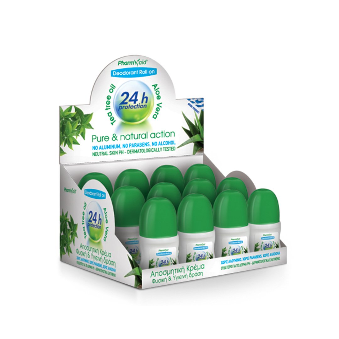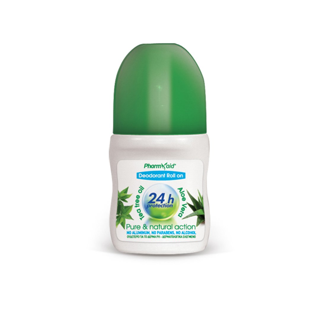Αποσμητική κρέμα σε Roll-on με βιολογική αλόη και έλαιο τεϊόδεντρου (χωρίς αλουμίνιο). Η αποσμητική κρέμα της Pharmaid σε roll-on, βασισμένη στον φυσικό αντιβακτηριδιακό παράγοντα ελαίου τεϊόδεντρου και 3 ακόμη αποσμητικούς παράγοντες φυτικής προέλευσης, καταπολεμά αποτελεσματικά όλη μέρα την κακοσμία που δημιουργείται στις μασχάλες-χωρίς να κλείνει τους πόρους-αφήνοντας το δέρμα να αναπνέει. Απαλή, απορροφητική, ενυδατική σύνθεση χωρίς αλουμίνιο και οινόπνευμα, σας χαρίζει άνεση και αυτοπεποίθηση που διαρκεί. Με διακριτικό άρωμα φρεσκάδας,καταλληλο για άνδρες και γυναίκες.