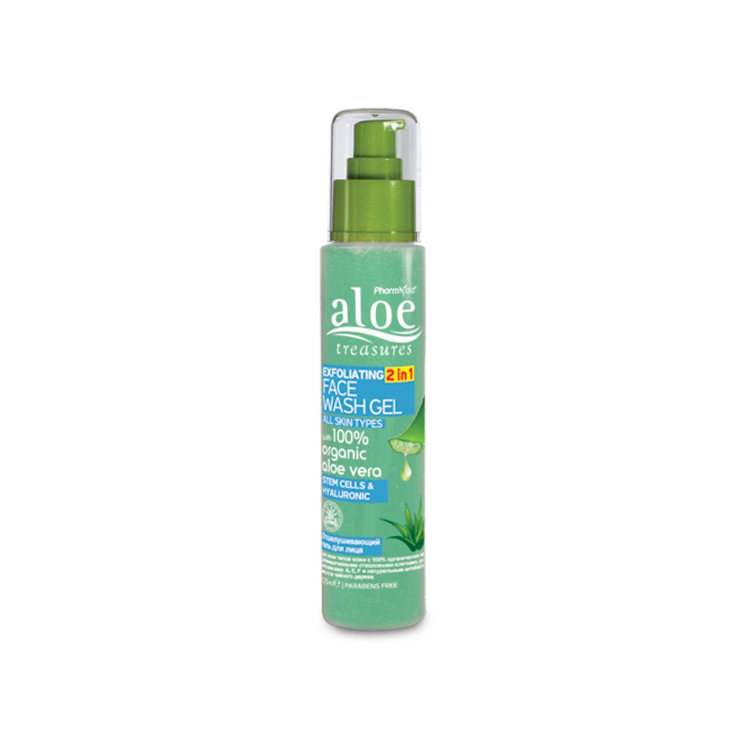 Απαλό ζελέ καθαρισμού & απολέπισης προσώπου 2 σε 1. Mε 100% βιολογική αλόη, αναζωογονητικά φυτικά βλαστοκύτταρα, ενυδατικό υαλουρονικό, βιταμίνες Α, Ε, F και φυσικό αντιβακτηριδιακό έλαιο τεϊόδενδρου. Ειδικά σχεδιασμένη σύνθεση με ήπια καθαριστικά συστατικά και πολύ λεπτούς σφαιρικούς κόκκους από κουκούτσια ελιάς, καθαρίζει βαθιά το δέρμα χωρίς να το ξηραίνει, ενώ ταυτόχρονα απομακρύνει τα επιφανειακά νεκρά κύτταρα. Βελτιώνει την όψη της επιδερμίδας του προσώπου, αφήνοντάς τη λεία, απαλή και αναζωογονημένη.