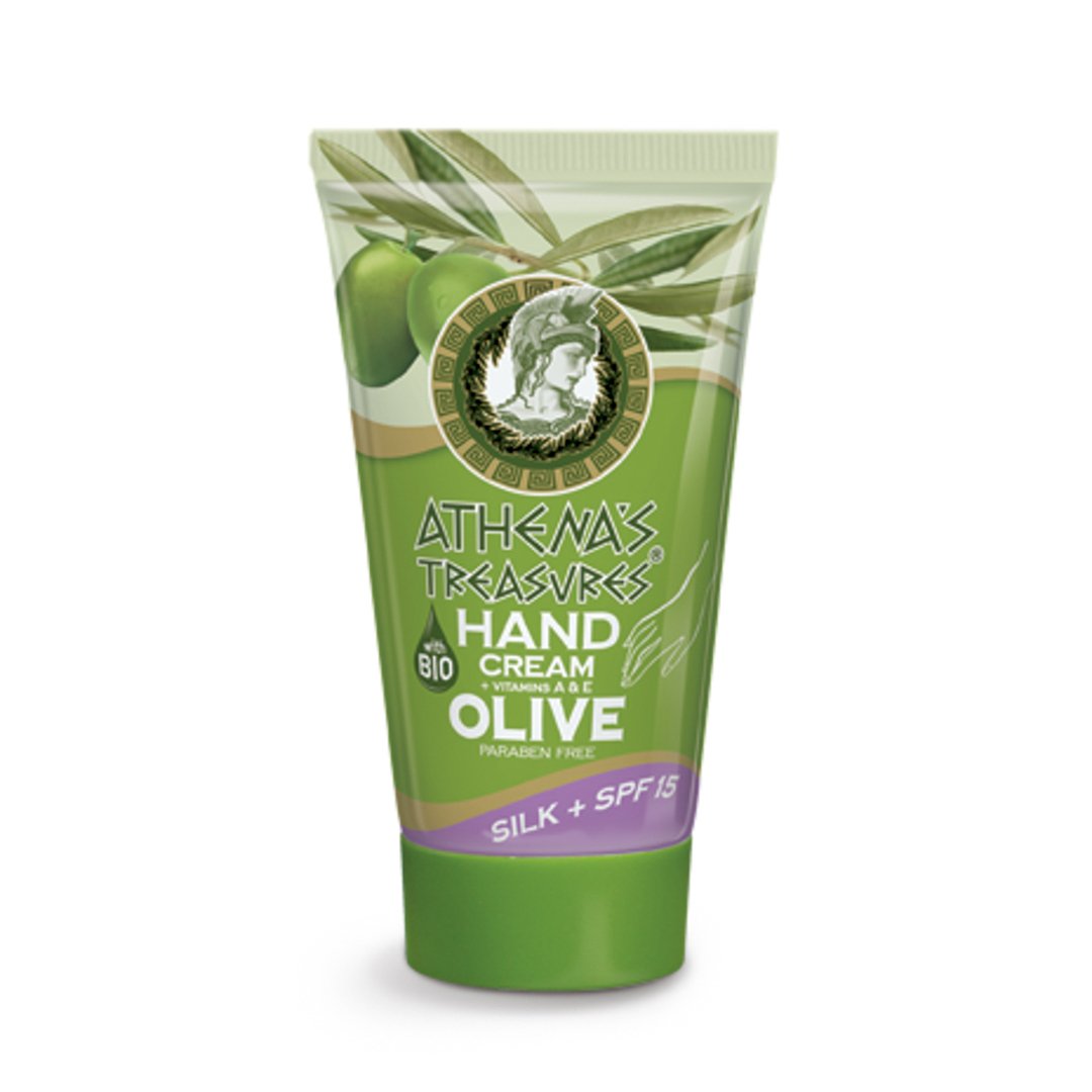 Ενυδατική κρέμα χεριών με βιολογικό λάδι, εκχύλισμα φύλλων ελιάς και πρωτείνες μεταξιού. Ενισχυμένη με Βιταμίνες Α, Ε, πανθενόλη, βούτυρο καριτέ, ενυδατικά, αντιγηραντικά συστατικά και αντηλιακό δείκτη προστασίας ’15’.
