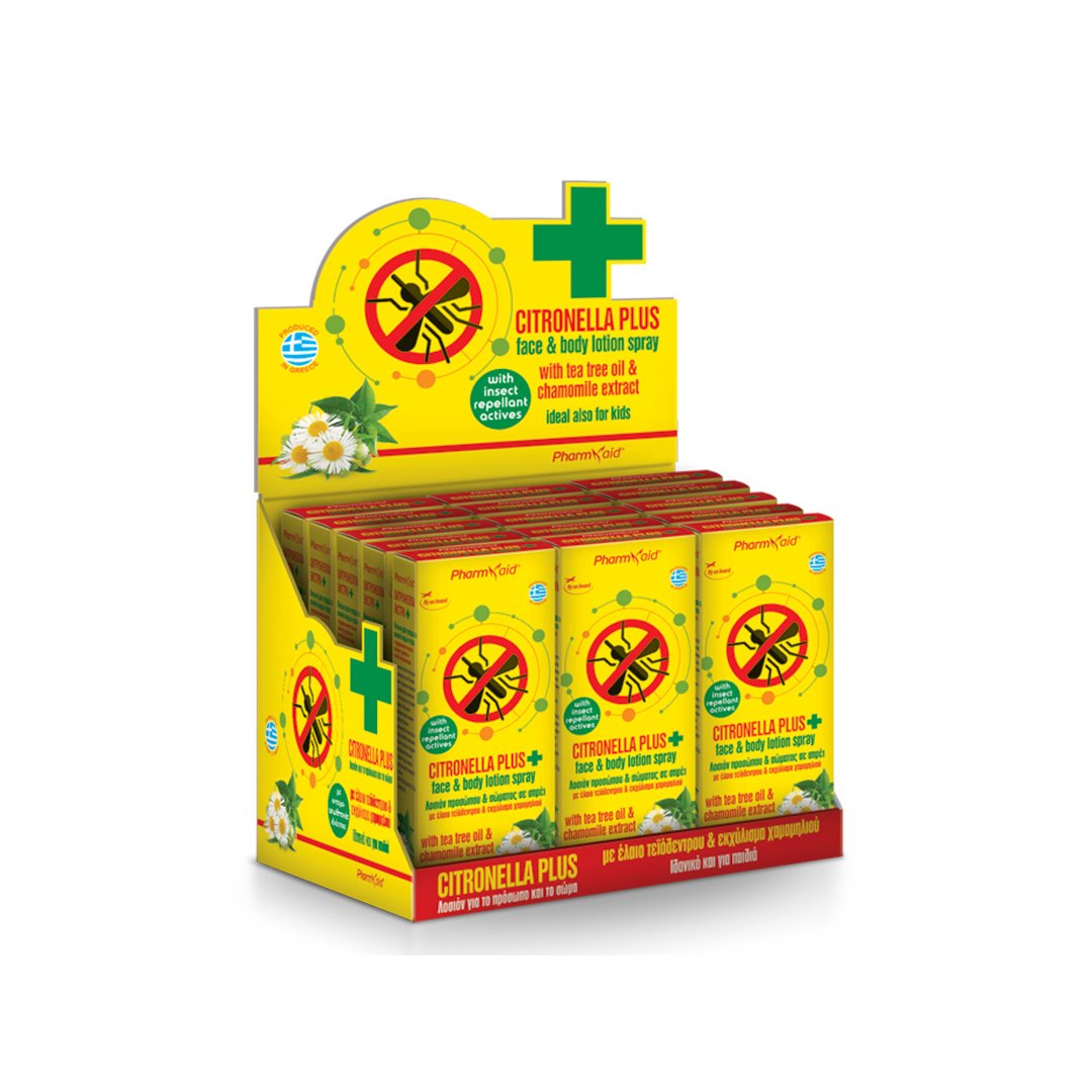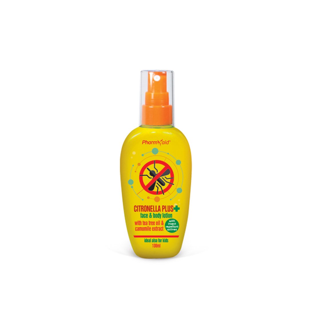 Λοσιόν για το πρόσωπο και το σώμα ενάντια στα τσιμπήματα με έλαιο τεϊόδεντρου και εκχύλισμα χαμομηλιού.Η ενισχυμένη λοσιόν προσώπου και σώματος της Pharmaid, περιέχει φυσικό αιθέριο έλαιο σιτρονέλας, γνωστό για τις εντομοαπωθητικές του ιδιότητες. Εμπλουτισμένη με έλαιο τεϊόδεντρου (φυσικό αντιβακτηριδιακό) και αντιφλογιστικά συστατικά χαμομήλι και αλλαντοϊνη. Περιποίηση και προστασία. Ιδανικό και για παιδιά άνω των 3 ετών.